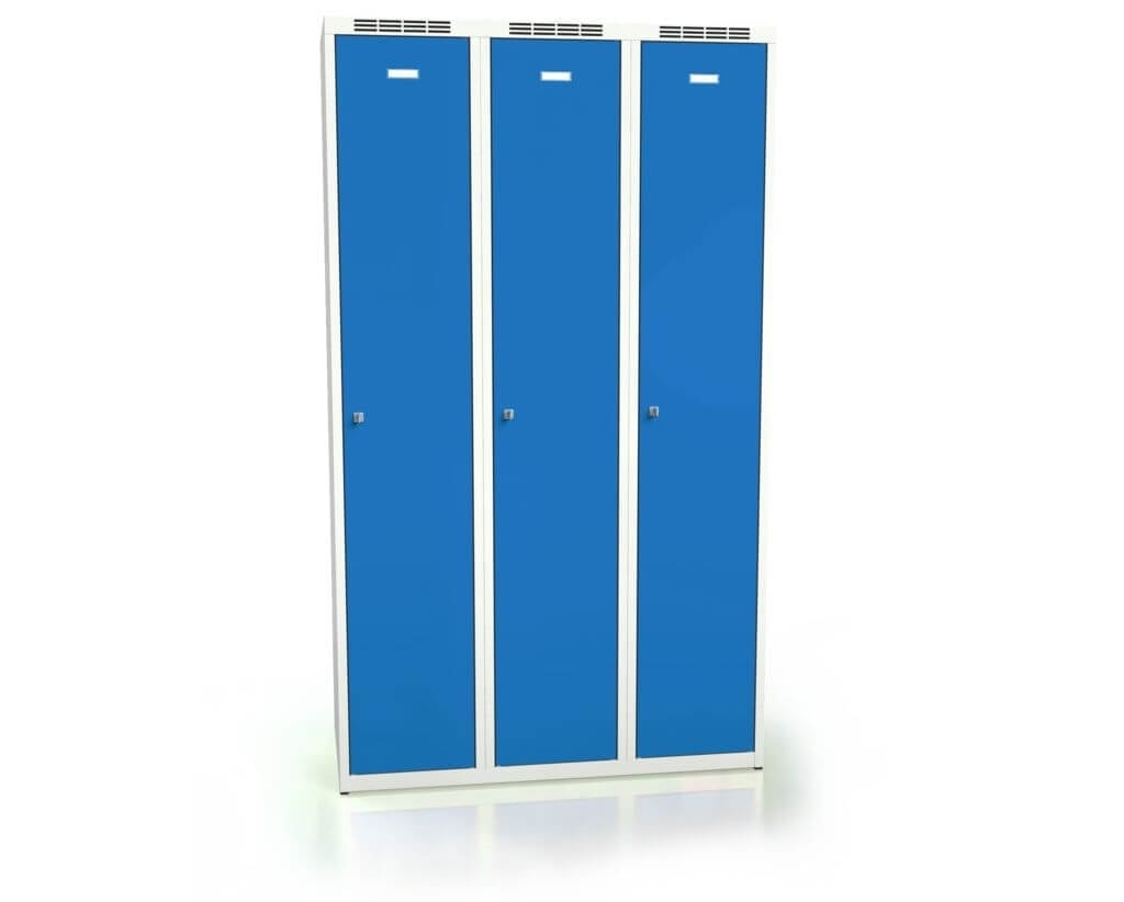 Dette 3-personers omklædningsskab er kendetegnet ved øget komfort og høj kvalitet. Der er to muligheder for at opnå sikker stabilitet: fire fødder eller en stabil sokkelramme. Dørene kan have en anden RAL-farve fra skab til skab, så man f.eks. hurtigere kan orientere sig, mens skabskroppen leveres i lysegrå.