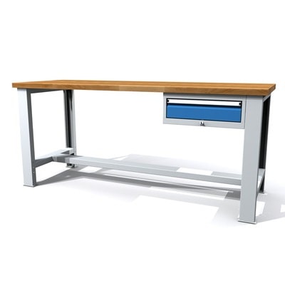 Oplev vores arbejdsbord med skuffe 200 cm, som måler 880x2000x700 mm (HxBxD) og er ideelt til ethvert professionelt arbejdsmiljø. Bordet har en robust, 40 mm tyk bordplade af massivt bøgetræ, som ikke kun er holdbar, men også æstetisk tiltalende.