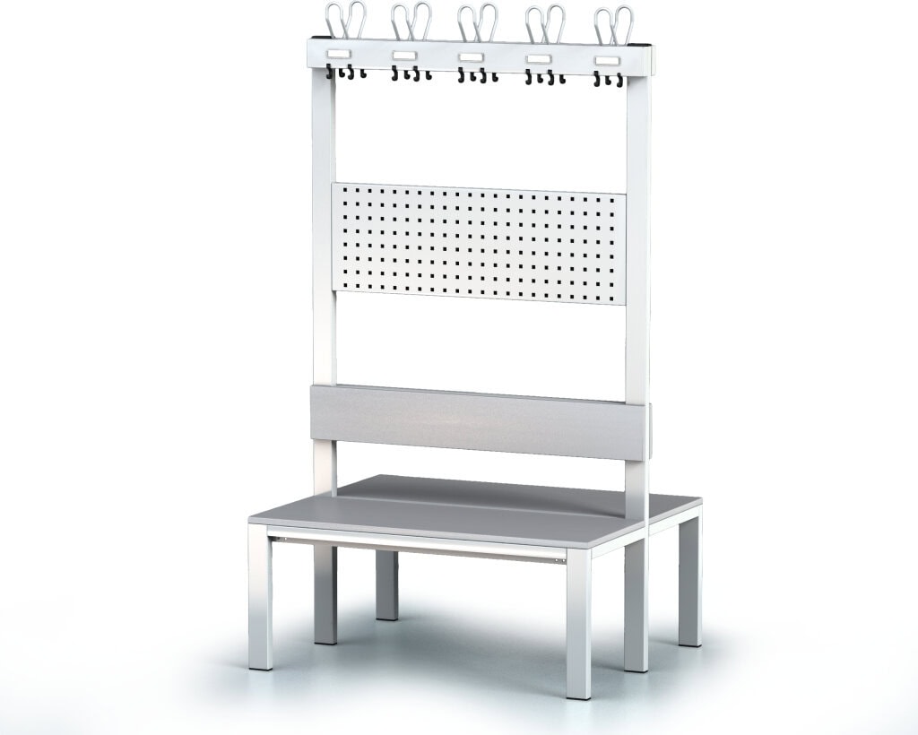 Den dobbeltsidede bænk med krogskinne er ikke kun funktionel, men også æstetisk tiltalende. Den er en ideel løsning for alle, der sætter pris på organisation og design. Uanset om det er i skolen, i gymnastiksalen eller i omklædningsrummet - denne bænk opfylder alle krav til et moderne og praktisk møbel.