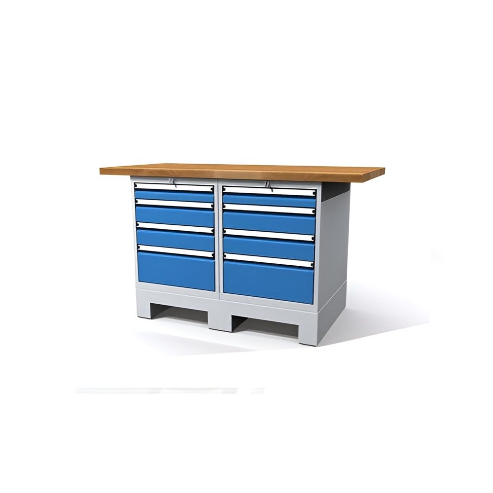 Kassearbejdsbordet på 880x1500x700 mm er en ægte allrounder til ethvert værksted. Med sin robuste bøgetop og to integrerede skuffeskabe giver det ikke kun en stabil arbejdsflade, men også masser af opbevaringsplads til værktøj og materialer. Den lysegrå RAL7035-farve giver arbejdsbænken et moderne og tidløst design, der passer perfekt ind i ethvert miljø.
