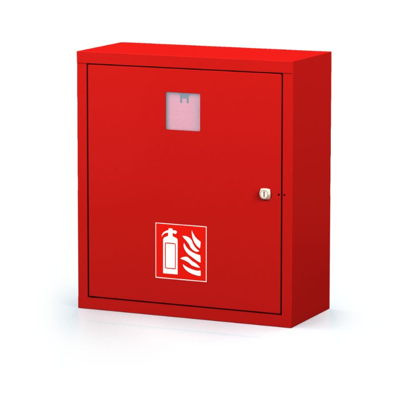 Skab til 2 brandslukkere 6 KG, udvendige mål 560x500x220 mm, design: sort metalplade, pulverlakeret i rød farve, lås: cylinderlås, nøgleboks i døren, perforering til tætning, egnet til indendørs brug