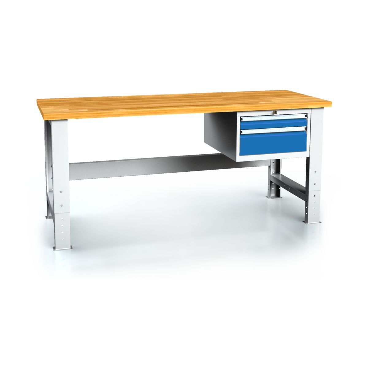 Arbejdsbordet imponerer med sit moderne design i lysegrå RAL7035, som passer harmonisk ind i ethvert værkstedsmiljø. Skuffefronterne og lågerne kan tilpasses, så arbejdsbordet kan designes efter personlige præferencer. Fodforbindelsesrøret, som kan monteres i to positioner, giver ekstra stabilitet og fleksibilitet.