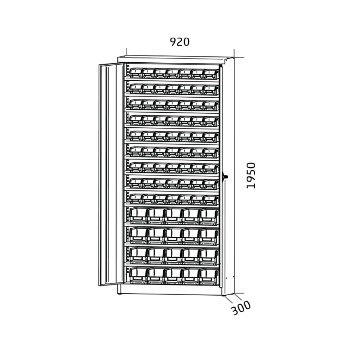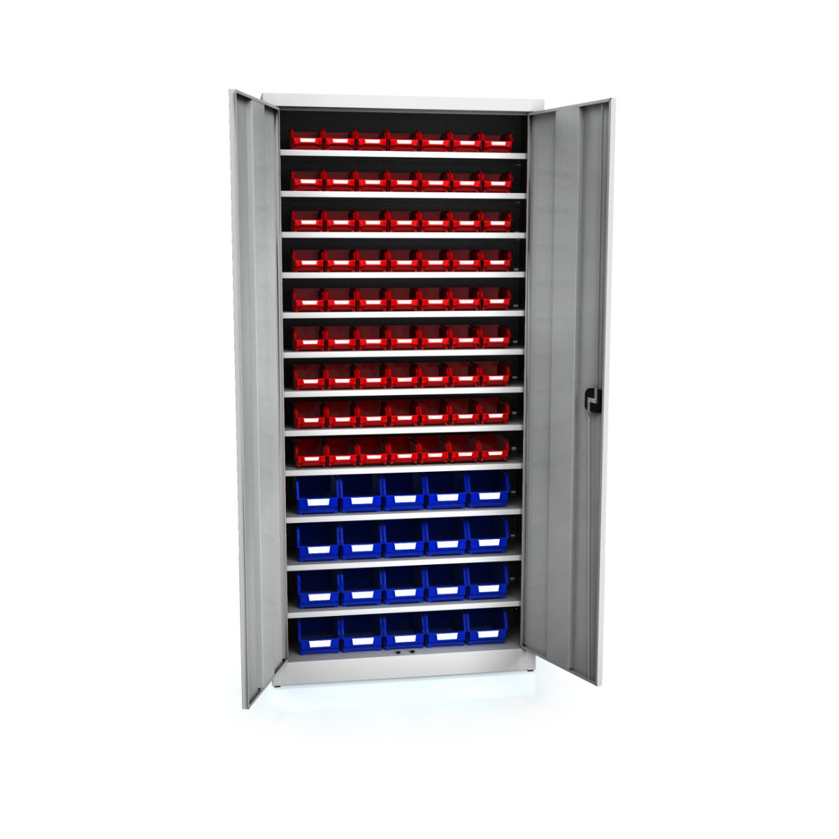 En fremragende egenskab ved dette skab er de fem galvaniserede hylder, som ikke kun er stabile og holdbare, men også har en høj bæreevne. Så du kan være sikker på, at dine materialer og dit værktøj altid er i gode hænder. De åbne opbevaringsrum, i alt 36 af typen SB2C med udvendige mål på 73x103x166 mm og 20 af typen SB3M med udvendige mål på 124x146x237 mm, giver mulighed for en klar og enkel organisering. Hvert rum er designet, så man hurtigt kan se, hvad der er indeni, hvilket øger effektiviteten i arbejdet betydeligt.