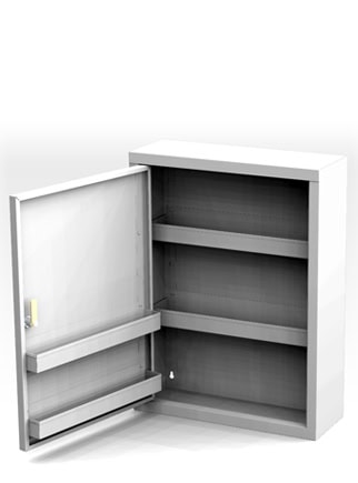 En fremragende egenskab ved dette skab er de to robuste hylder, som giver sikker opbevaring af din medicin og medicinske redskaber. Det kasseformede design forhindrer, at opbevarede medicinske forsyninger falder ud, så alt bliver på sin plads. Hyldemålene på 50x80x330 mm (HxBxD) giver tilstrækkelig plads til forskellige produkter, mens det ekstra hylderum i døren på 50x50x275 mm (HxBxD) er en praktisk mulighed for opbevaring af mindre genstande.