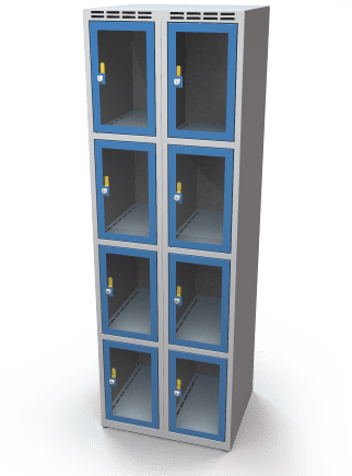 Skab i metal med glasdøre møntindkastlås 8 rum kan monteres med den høje sokkel (højde 160 mm i stedet for 40 mm)
