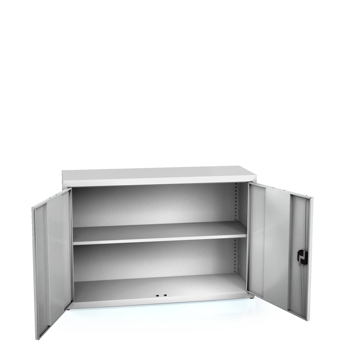 800x1200x400 mm (HxBxD), svejset konstruktion, 40 mm høj sokkel, 1x lakeret hylde, justerbar i trin på 25 mm, belastningskapacitet 60 kg/hylde, trepunktslås, cylinderlås med drejeligt håndtag, skabsdøre forstærket i midten, korpus/døre RAL7035 lysegrå, pulverlakeret, forbindelsesmateriale
