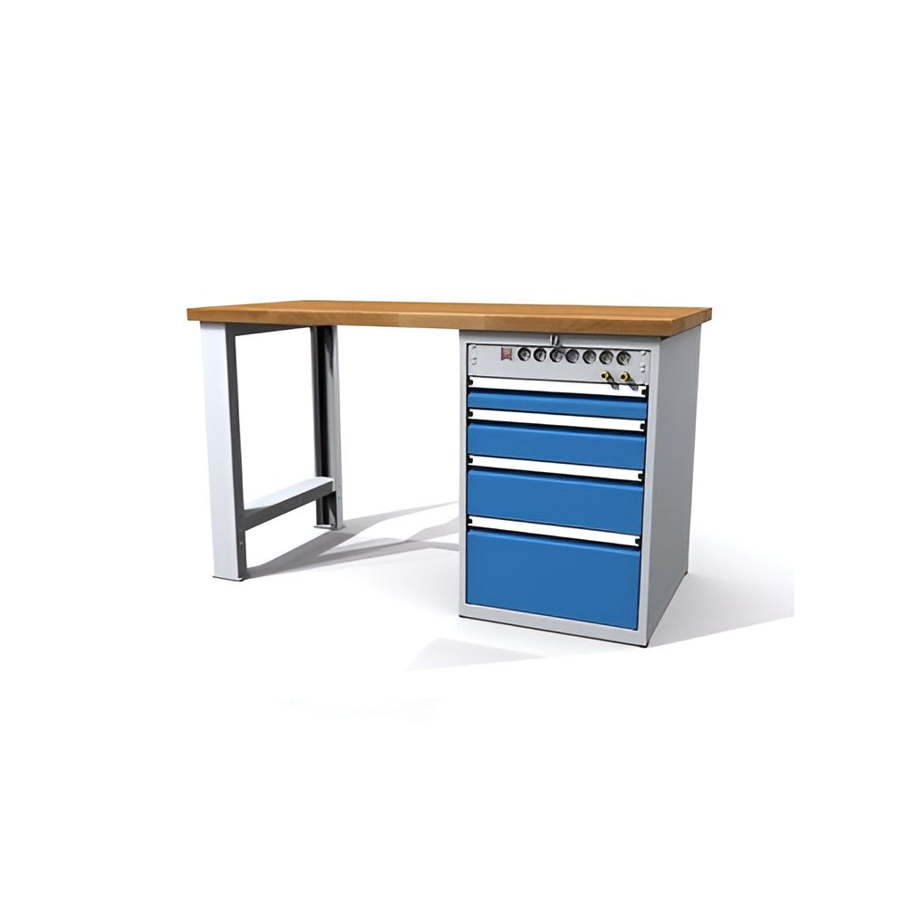 880x1500x700 mm, vandfast massiv bøgetræsplade, 40 mm tyk, fasede kanter, behandlet med linolielak, 2x DPNOH17UN - sokkel ikke justerbar, 1x DKP272717U4KEVH - professionelt skuffeskab med skuffer, 1x skuffe 2U, 1x skuffe 3U, 1x skuffe 4U, 1x skuffe 6U, variant A - 80% udtræk, bæreevne 90 kg/skuffe, Variant B - 100% udtræk, bæreevne 65 kg/skuffe, centrallås med cylinderlås, praktiske ALU-grebslister med mærkningsfelt, indbygget 19-tommers stikdåseliste, 1U-liste med 2 lynkoblinger med trykluftdrev, farve korpus/fødder lysegrå RAL7035, skuffefronter/døre valgbare