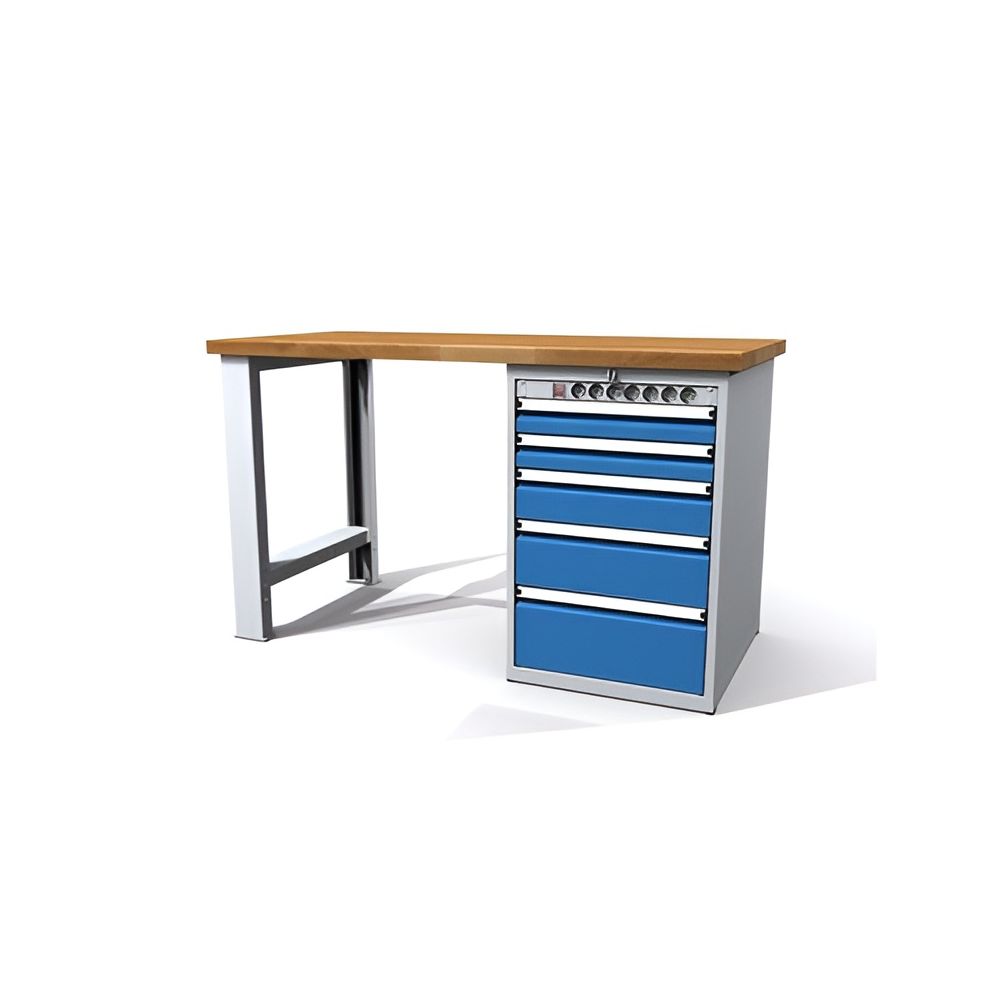Et særligt højdepunkt ved dette arbejdsbord er det integrerede skuffeskab, som er udstyret med fem skuffer. De fås i størrelserne 2U, 3U, 4U og 5U og giver derfor tilstrækkelig opbevaringsplads til værktøj og materialer. Skufferne fås i to versioner: version A med 80%-skinner og en belastningskapacitet på 90 kg pr. skuffe og version B med 100%-skinner og en belastningskapacitet på 65 kg pr. skuffe. Det giver dig mulighed for at tilpasse arbejdsbordet optimalt til dine behov.