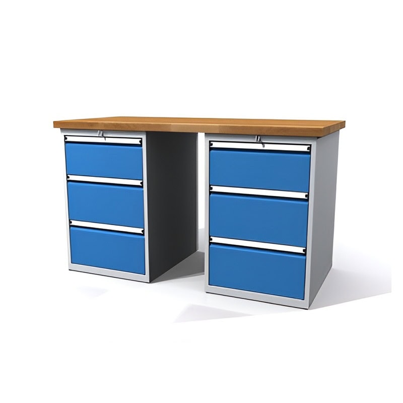 Dette arbejdsbord er ikke bare et møbel, men en pålidelig partner i dit værksted. De to skuffeskabe, model DKP272717U3, giver tilstrækkelig opbevaringsplads til værktøj og materialer. Med en kombination af en skuffe med 5U og to skuffer med 6U har du fleksibilitet til at organisere dine redskaber optimalt. Skufferne fås i to varianter: variant A med 80%-udtræk og en belastningskapacitet på 90 kg pr. skuffe og variant B med 100%-udtræk og en belastningskapacitet på 65 kg pr. skuffe. Disse muligheder giver dig mulighed for at tilpasse arbejdsbordet nøjagtigt til dine behov.