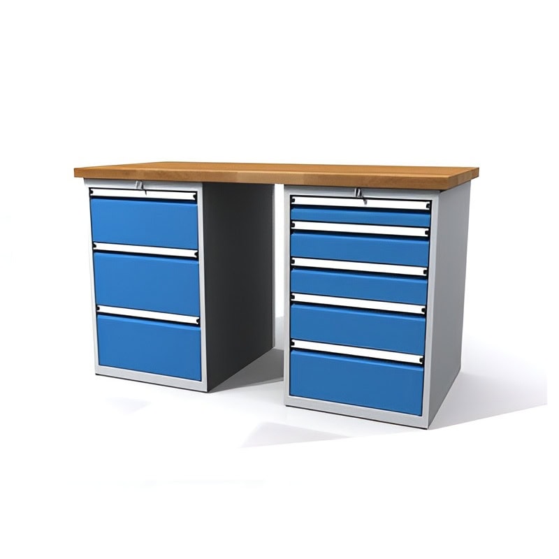 Arbejdsbordet imponerer ikke kun med sin funktionalitet, men også med sit attraktive design. Korpus og ben er udført i en moderne lysegrå RAL7035, mens skuffefronter og låger kan vælges individuelt, så de passer perfekt ind i dit værkstedsmiljø.