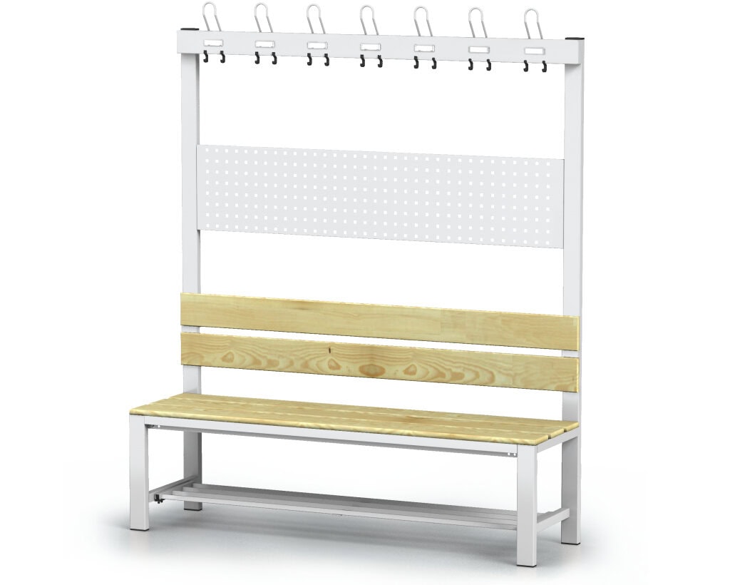 Omklædningsbænken med knagerække og skohylde er den perfekte løsning til alle, der ønsker at kombinere funktionalitet og stil i ét produkt. Bænken måler 1800x1500x430 mm (HxBxD) og giver tilstrækkelig plads og komfort til omklædningsrum i skoler, sportsklubber eller fitnesscentre. Kombinationen af robust design og materialer af høj kvalitet gør den til en uundværlig del af ethvert omklædningsrum.