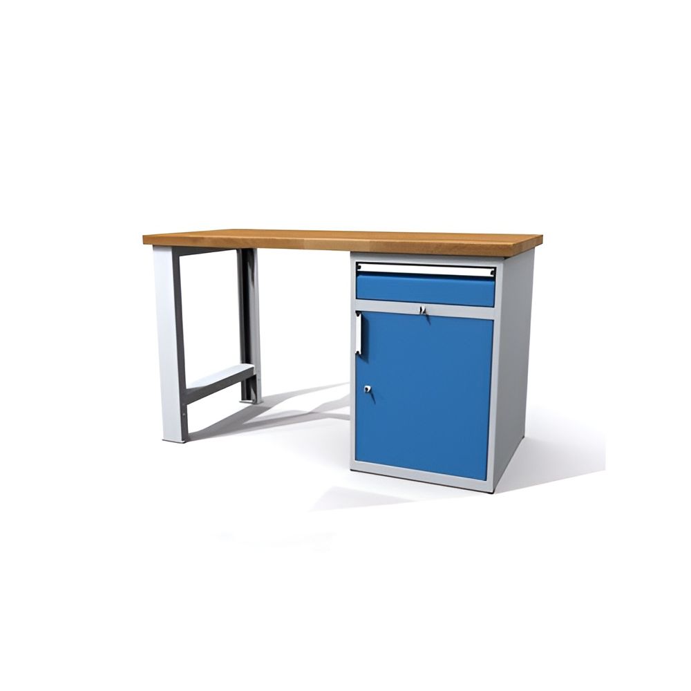 En anden praktisk funktion er den justerbare hylde, som kan tilpasses i trin på 25 cm. Med en belastningskapacitet på 50 kg pr. hylde giver den ekstra opbevaringsplads til forskellige redskaber og materialer. Korpusens og benenes farve i lysegrå RAL7035 giver bordet en tidløs elegance, mens skuffefronterne og lågen kan designes i en farve efter eget valg, så de passer perfekt til dine personlige præferencer eller eksisterende møbler.
