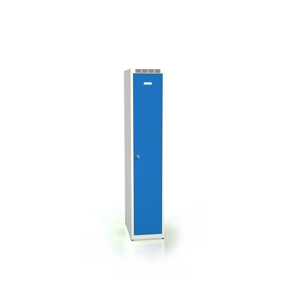 1500x300x500 mm (HxBxD), 1-delt skoleskab, dobbeltvæggede døre, døråbningsbegrænser, sokkel 40 mm (HxBxD), hattehylde, bøjlestang med 3 kroge, lås: cylinderlås med 2 nøgler eller sikkerhedsboltlås, farve korpus lysegrå RAL7035/døre valgfri, pulverlakeret