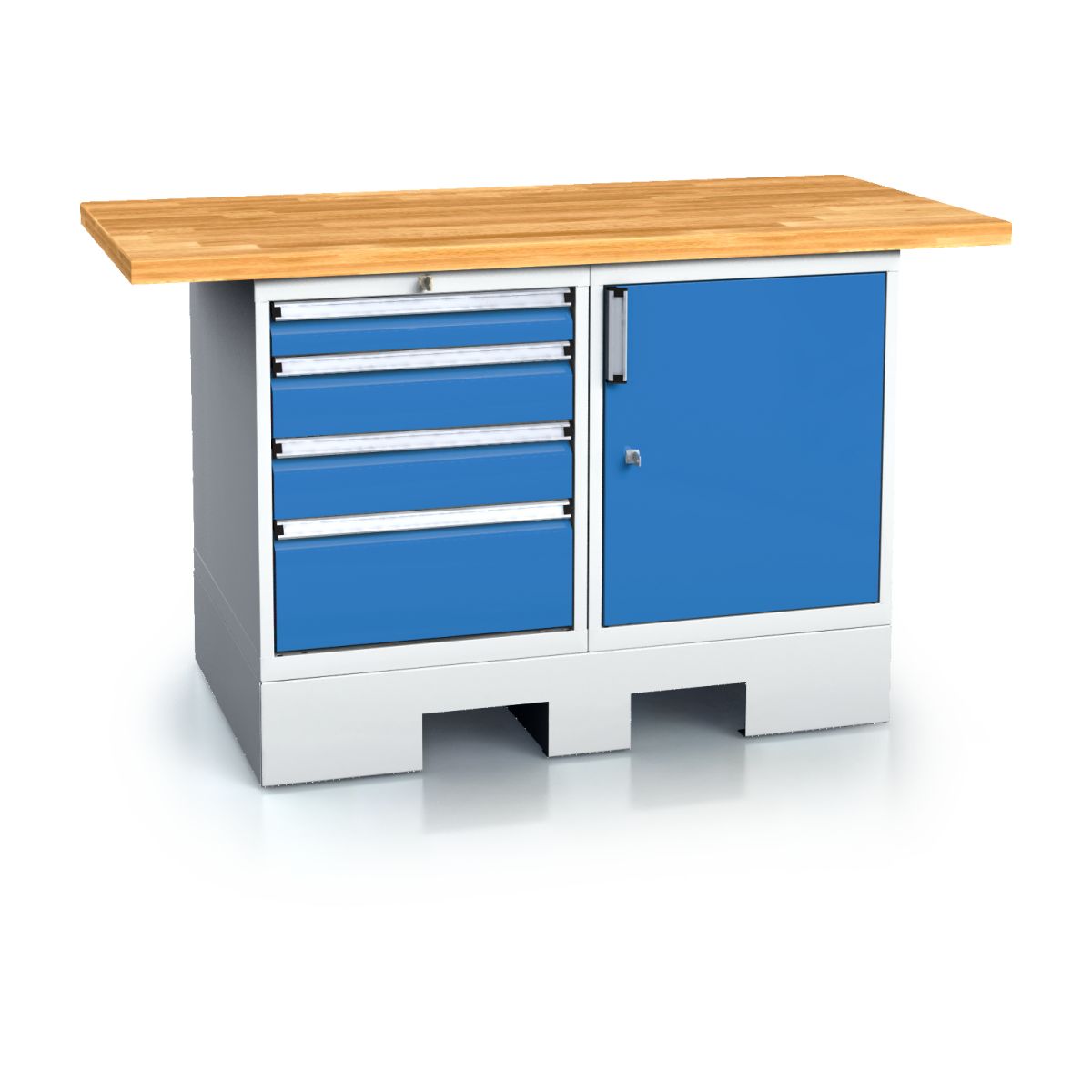 Arbejdsbordet er udstyret med et skuffeskab, der har fire skuffer i forskellige størrelser: en skuffe med 2U, to skuffer med 3U og en skuffe med 5U. Denne variation giver mulighed for fleksibel og organiseret opbevaring af værktøj og materialer. Der er to varianter at vælge imellem: Variant A med 80%-udtræk og en belastningskapacitet på 90 kg pr. skuffe og variant B med 100%-udtræk og en belastningskapacitet på 65 kg pr. skuffe. Begge versioner er udstyret med en praktisk ALU-håndtagsliste med mærkningsfelt for nem håndtering og organisering.
