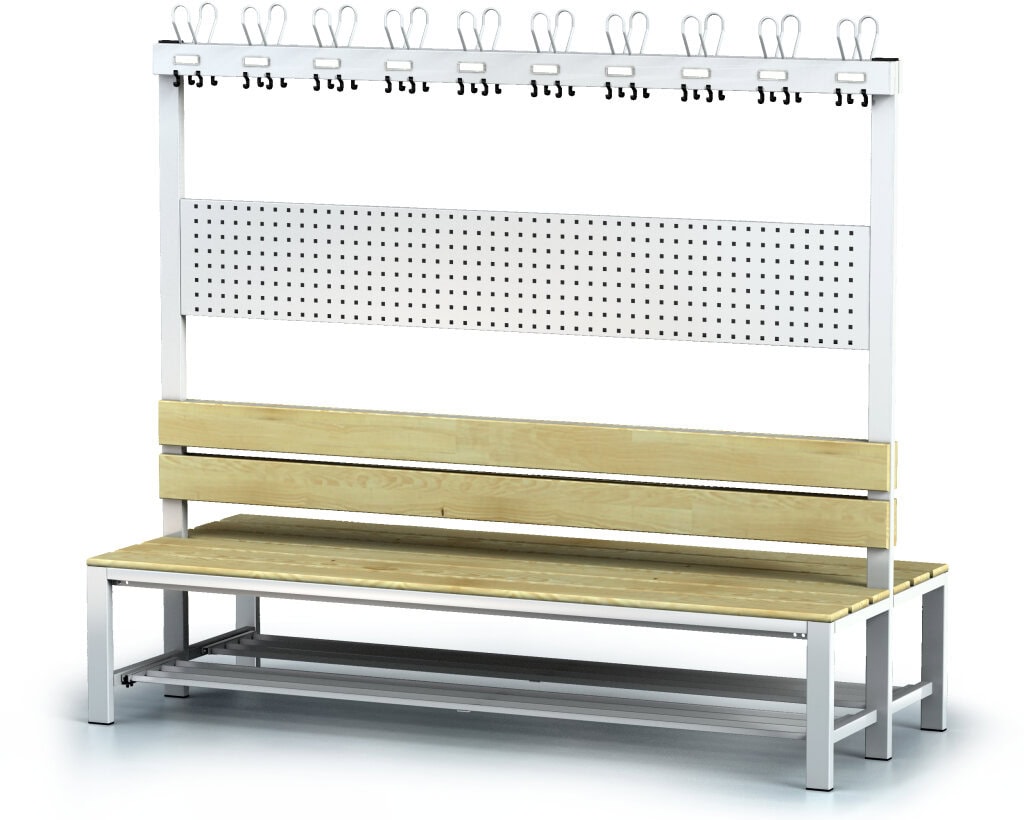 Bænken er udstyret med en krogskinne med 10 eller 20 knager alt efter behov. Det giver dig plads nok til at hænge tøjet pænt op og holde det organiseret. Den integrerede skohylde sikrer, at skoene kan holdes rene og organiserede, hvilket er særligt nyttigt i omklædningsrum i sportsklubber, fitnesscentre eller skoler.