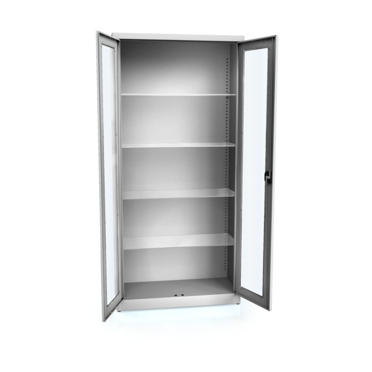 Den lysegrå pulverlakering (RAL7035) giver ikke kun skabet et moderne udseende, men sikrer også høj modstandsdygtighed over for ridser og slitage. Glasdørene af 4 mm sikkerhedsglas giver et klart udsyn til indholdet og hjælper med at holde orden. Det betyder, at du hurtigt kan finde det, du leder efter, uden at skulle lede i lang tid.