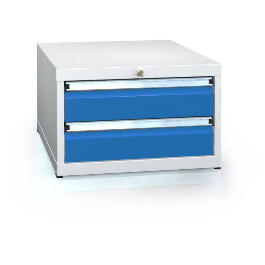 Det vægmonterede skuffemøbel er visuelt imponerende med sin moderne korpus i lysegrå (RAL7035), som falder diskret ind i ethvert miljø. Skuffefronterne fås i en række farver, så du kan sætte specifikke accenter eller matche møblet til det eksisterende farveskema. Pulverlakeringen af høj kvalitet sikrer en holdbar, letplejelig overflade, der bevarer sin glans selv ved intensiv brug.