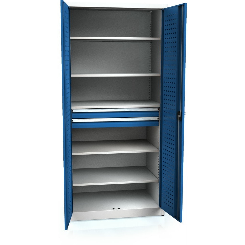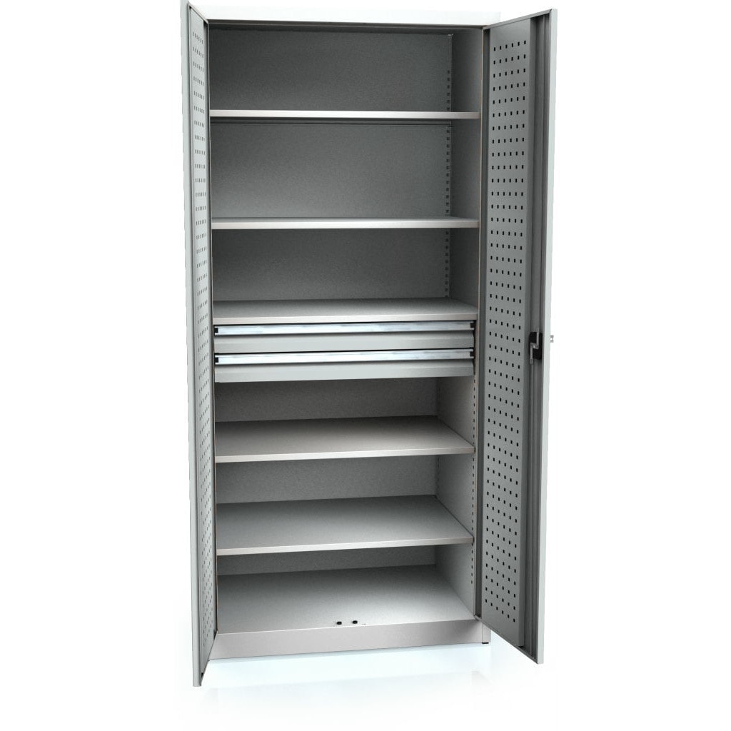 1950x920x600 mm (HxBxD), værkstedsskab med 2 skuffer, hængslede døre, 4x lakerede hylder, justerbare i trin på 25 mm, 1x fast hylde, bæreevne 100 kg, trepunktslås, cylinderlås med drejeligt håndtag, 2 nøgler, 2x skuffe 2U, fronthøjde 85 mm, sidehøjde 58 mm, skuffekapacitet 90 kg, 80% udtræk, indvendige skuffemål 757×451 mm, uden skillevæg, korpus lysegrå RAL7035, pulverlakeret, højdejusterbare fødder