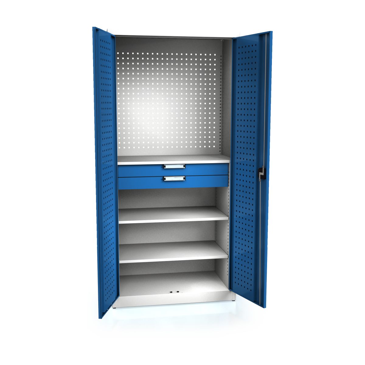 Værktøjsskab 195 cm, 3 hylder + 2 skuffer, perforeret bagpanel