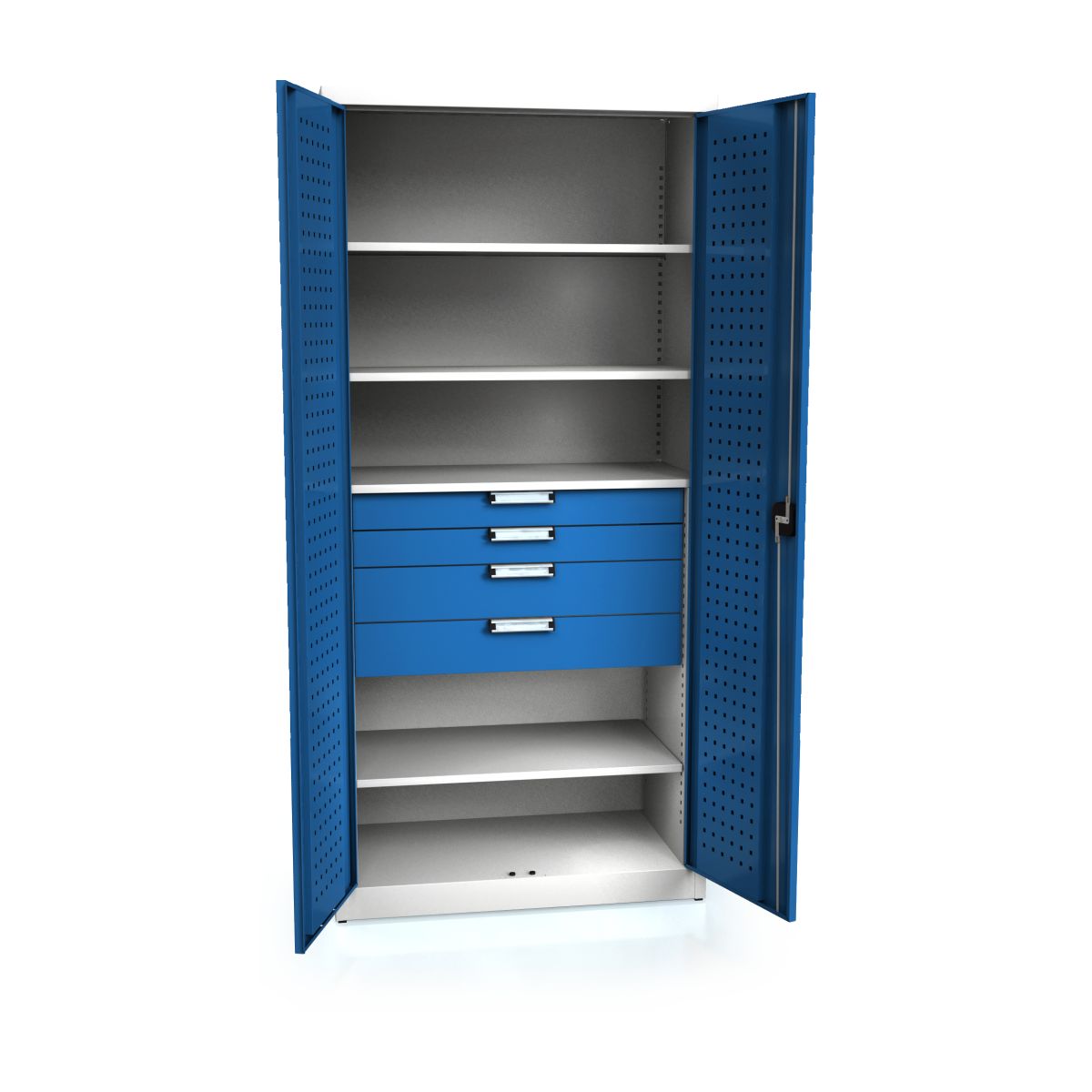 De fire skuffer, fordelt på to med 2 højdeenheder (2U) og to med 3 højdeenheder (3U), hver med en belastningskapacitet på 40 kg og 100%-udtræk, giver masser af plads til værktøj, tilbehør eller reservedele. Takket være de dobbeltvæggede hængslede døre med cylinderlås og trepunktslås forbliver indholdet sikkert beskyttet mod uautoriseret adgang. Den pulverlakerede overflade i lysegrå (RAL7035) giver et moderne look og er særligt modstandsdygtig over for ridser og korrosion. Dørenes og skuffernes fronter kan indfarves individuelt, så skabet passer til det eksisterende værkstedsdesign.