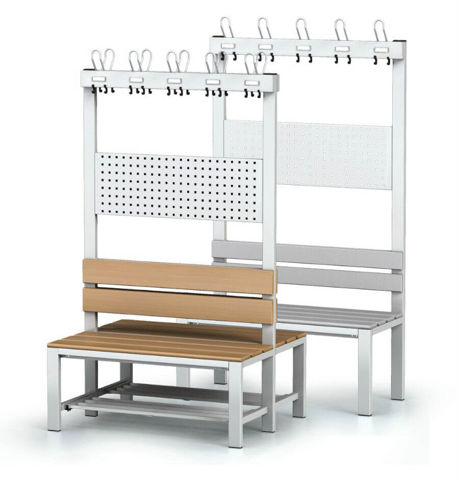 Bænke til omklædningsrum med krogskinne og melaminplade