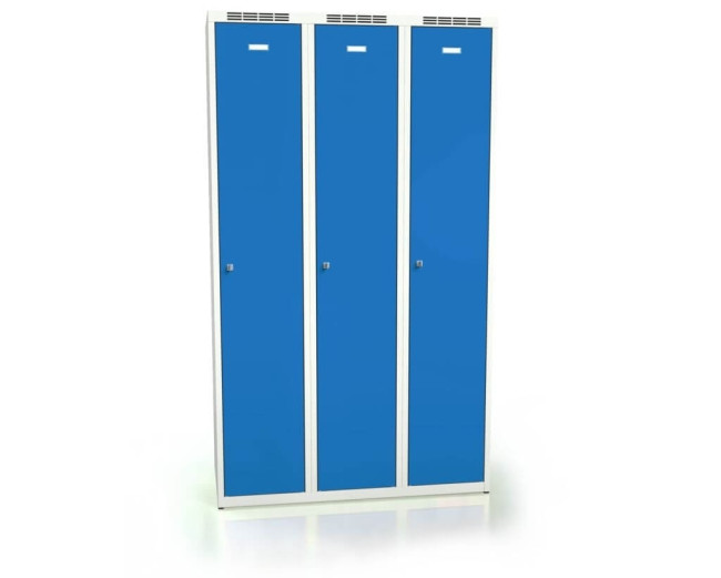 Dieser 3er Umkleidespind zeichnet sich durch erhöhten Komfort und einer anspruchsvollen Qualität aus. Es gibt zwei Möglichkeiten, um eine sichere Standfestigkeit zu erreichen, einmal durch vier Füße oder einen stabilen Sockelrahmen. Die Türen können z.B. zur schnelleren Orientierung, von Spind zu Spind, einen unterschiedlichen RAL-Ton aufweisen, wobei der Schrankkörper in Lichtgrau zur Auslieferung kommt.