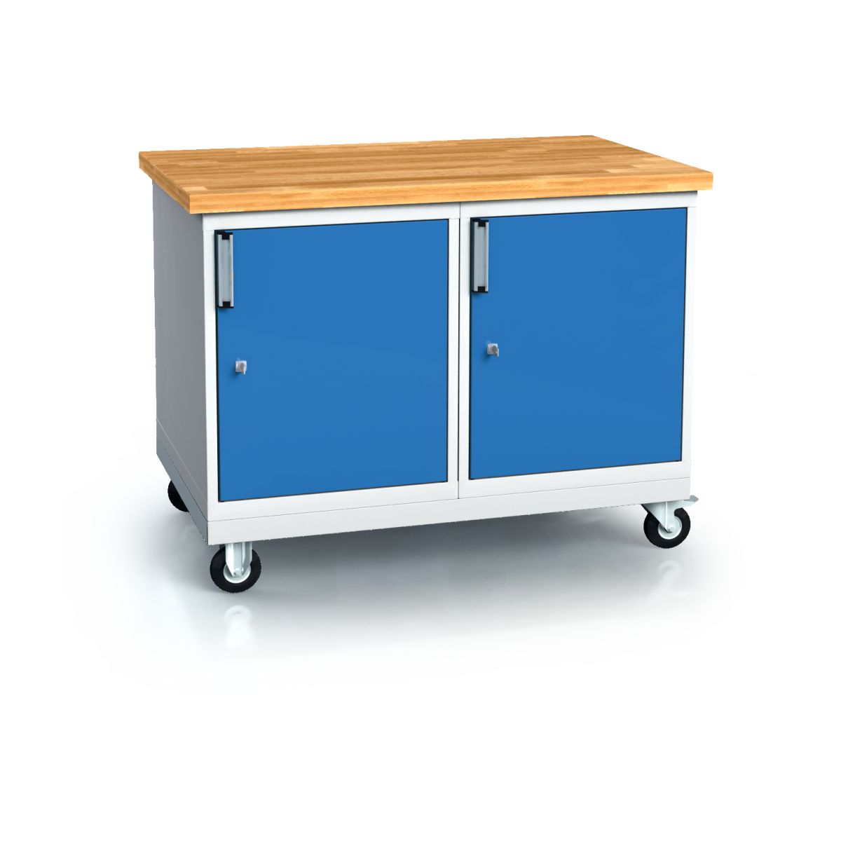Das fahrbare Gestell DPPPPO2 ist speziell zur Halterung der Schubladenschränke der DKP2727-Reihe konzipiert. Mit zwei Bockrollen und zwei Lenkrollen mit Bremse, jeweils mit einem Durchmesser von 100 mm, lässt sich die Werkbank mühelos bewegen und sicher fixieren. Die Manipuliergriffleiste sorgt für eine einfache Handhabung, während die lichtgraue Farbe des Korpus und der Füße ein modernes und professionelles Erscheinungsbild verleiht. Die Schubladenfronten und Türen sind in verschiedenen Farben wählbar, sodass die Werkbank individuell an die Bedürfnisse und den Stil der Werkstatt angepasst werden kann.