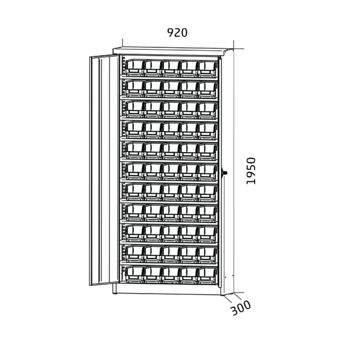 Der Materialschrank mit Behältern ist die ideale Lösung für alle, die Ordnung und Effizienz in ihrem Arbeitsumfeld schätzen. Mit seinen großzügigen Außenmaßen von 1950x920x300 mm (HxBxT) bietet dieser Schrank nicht nur ausreichend Stauraum, sondern auch eine durchdachte Anordnung, die den Zugriff auf Ihre Materialien erleichtert.