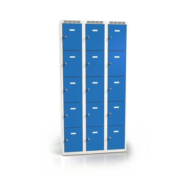 Schließfächer Schrank mit 15 Türen bieten eine durchdachte Lösung für sichere und übersichtliche Aufbewahrung in Schulen, Unternehmen, Fitnessstudios oder öffentlichen Einrichtungen. Mit den Maßen 180x90x50 cm (HxBxT) beziehungsweise 1800x900x500 mm passen sie optimal in unterschiedlichste Raumkonzepte und bieten auf kompakter Fläche viel Stauraum. Die robuste Stahlkonstruktion sorgt für Langlebigkeit und Stabilität, während die pulverbeschichtete Oberfläche in lichtgrau RAL7035 dem Schrank eine moderne, zeitlose Optik verleiht. Für die Türen stehen verschiedene Farben zur Auswahl, sodass sich der Schrank harmonisch in jedes Farbkonzept einfügt oder gezielt Akzente setzt.