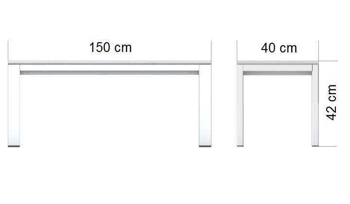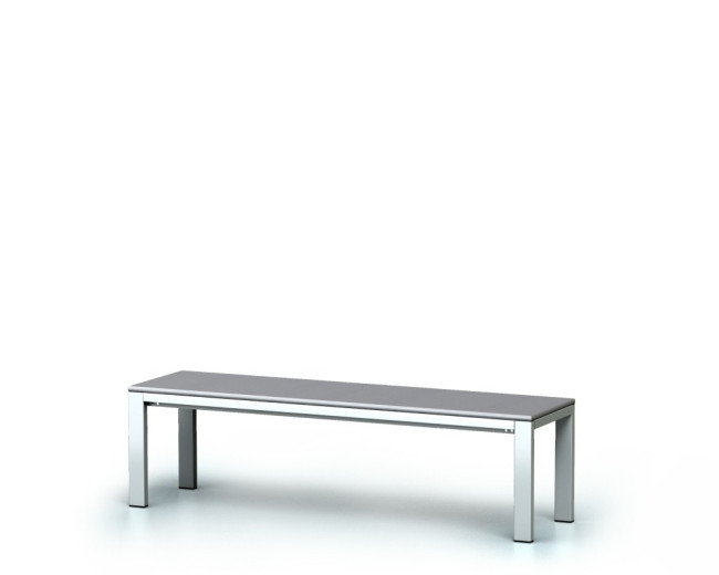 420x1500x400 mm (HxBxT), Sitzbank freistehend, Füße aus Vierkantrohr 60×30 mm, Sitzfläche – graue Melamin-Platte, Gleiter aus Kunststoff, Untergestellfarbe RAL7035, pulverbeschichtet