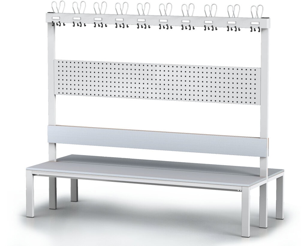 Ein herausragendes Merkmal dieser Sitzbank ist die doppelseitige Hakenleiste, die mit 10/20 Kleiderhaken ausgestattet ist. Diese Haken bieten genügend Platz für Jacken, Mäntel und Taschen, was sie ideal für den Einsatz in Umkleideräumen, Schulen oder Büros macht. Die Haken sind robust und langlebig, sodass sie auch bei häufiger Nutzung ihre Form und Funktion behalten.