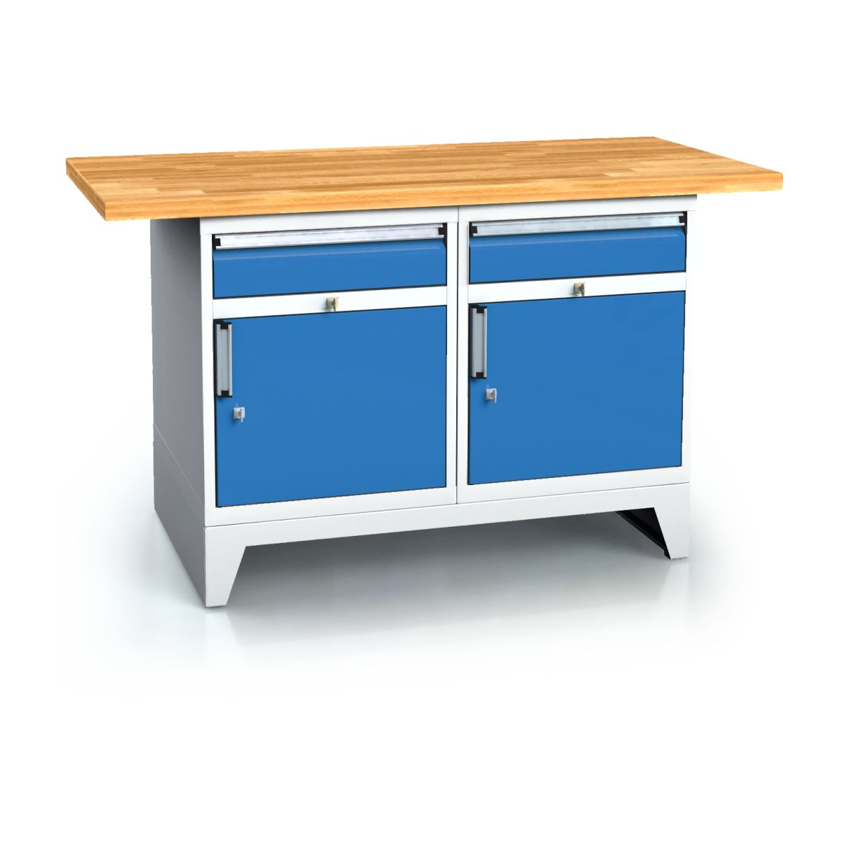 Das massive Gestell DPPNPO2 bietet eine stabile Basis für die Schubladenschränke und ist in einem eleganten lichtgrau RAL7035 gehalten, das sich harmonisch in jede Umgebung einfügt. Die Schubladenfronten und die Tür sind in verschiedenen Farben wählbar, sodass die Werkbank individuell an den persönlichen Geschmack oder das bestehende Farbkonzept angepasst werden kann.