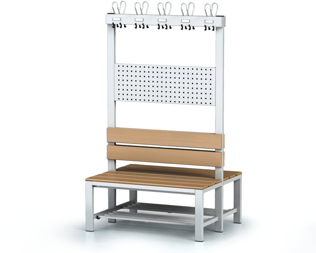 Die doppelseitige Umkleidebank mit Hakenleiste und Schuhablage ist die perfekte Lösung für Umkleideräume, die sowohl Funktionalität als auch Stil erfordern. Mit den Maßen von 1800x1000x830 mm (HxBxT) bietet diese Bank ausreichend Platz und Komfort für Benutzer, die ihre Kleidung und Schuhe ordentlich verstauen möchten.