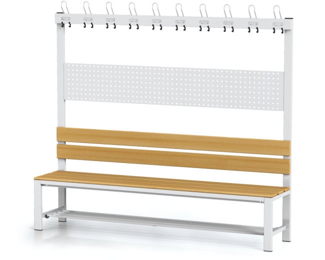 Ein herausragendes Merkmal dieser Umkleidebank ist die Hakenleiste, die mit 10 oder 20 Kleiderhaken ausgestattet ist. Diese Haken bieten genügend Platz, um Jacken, Mäntel oder Taschen ordentlich aufzuhängen. So bleibt der Raum stets aufgeräumt und organisiert. Die Haken sind robust und langlebig, sodass sie auch bei häufiger Nutzung ihre Form und Funktion behalten.