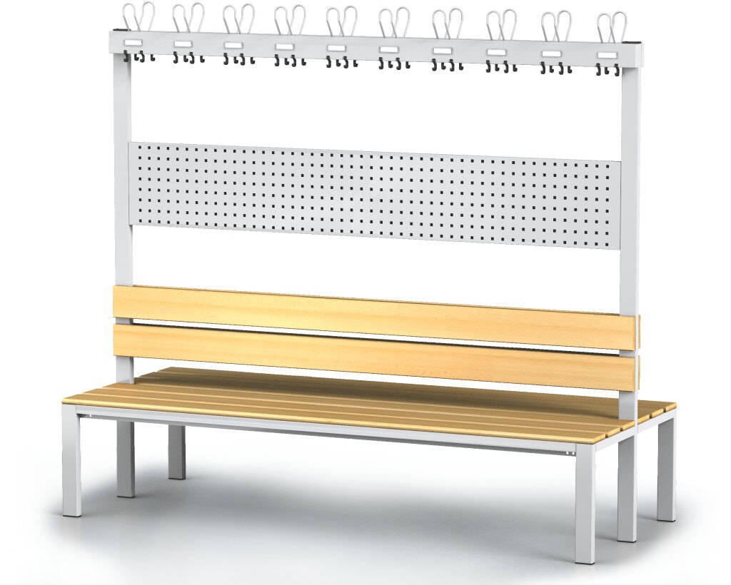 Ein herausragendes Merkmal dieser Umkleidebank ist die doppelseitige Hakenleiste, die mit 10/20 Kleiderhaken ausgestattet ist. Diese bietet reichlich Platz für Kleidung, Taschen und andere persönliche Gegenstände, was sie ideal für Schulen, Sportvereine oder Fitnessstudios macht. Die Haken sind so konzipiert, dass sie robust und langlebig sind, um den täglichen Anforderungen standzuhalten.