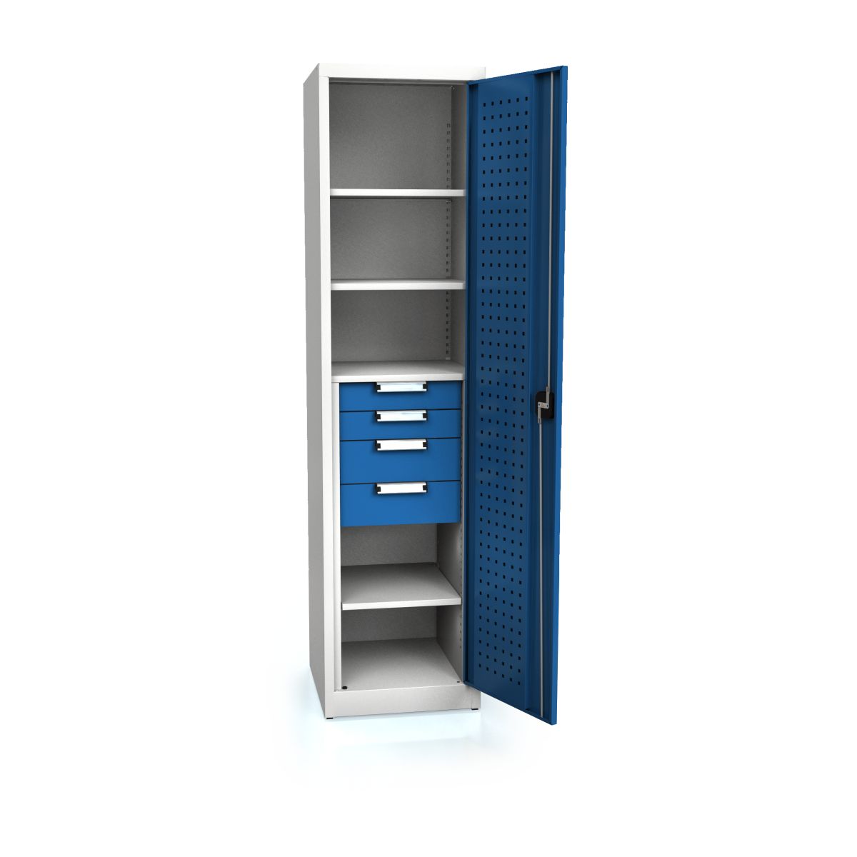 Werkzeugschrank, Maße: 1950x490x500 mm (HxBxT), 4 Fachböden, Tragfähigkeit 80 kg/Fachboden, in Raster von 25 mm verstellbar, Schubladen 2x 2U, 2x3U, Tragfähigkeit 40 kg, 100% Auszug, doppelwandige Tür mit Zylinderschloss und Dreipunkt-Schließmechanismus, Farbe Korpus lichtgrau RAL7035, Türen/Schubladenfronten wählbar, pulverbeschichtet