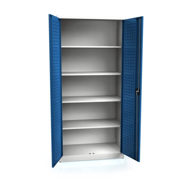Die doppelwandigen Flügeltüren sorgen für zusätzliche Stabilität und schützen den Inhalt vor Staub und unbefugtem Zugriff. Ein Zylinderschloss mit Dreipunkt-Schließmechanismus bietet ein hohes Maß an Sicherheit und gibt Ihnen die Gewissheit, dass Ihre Werkzeuge stets geschützt sind. Die pulverbeschichtete Oberfläche ist nicht nur robust und langlebig, sondern auch pflegeleicht und widerstandsfähig gegen Kratzer und Korrosion.
