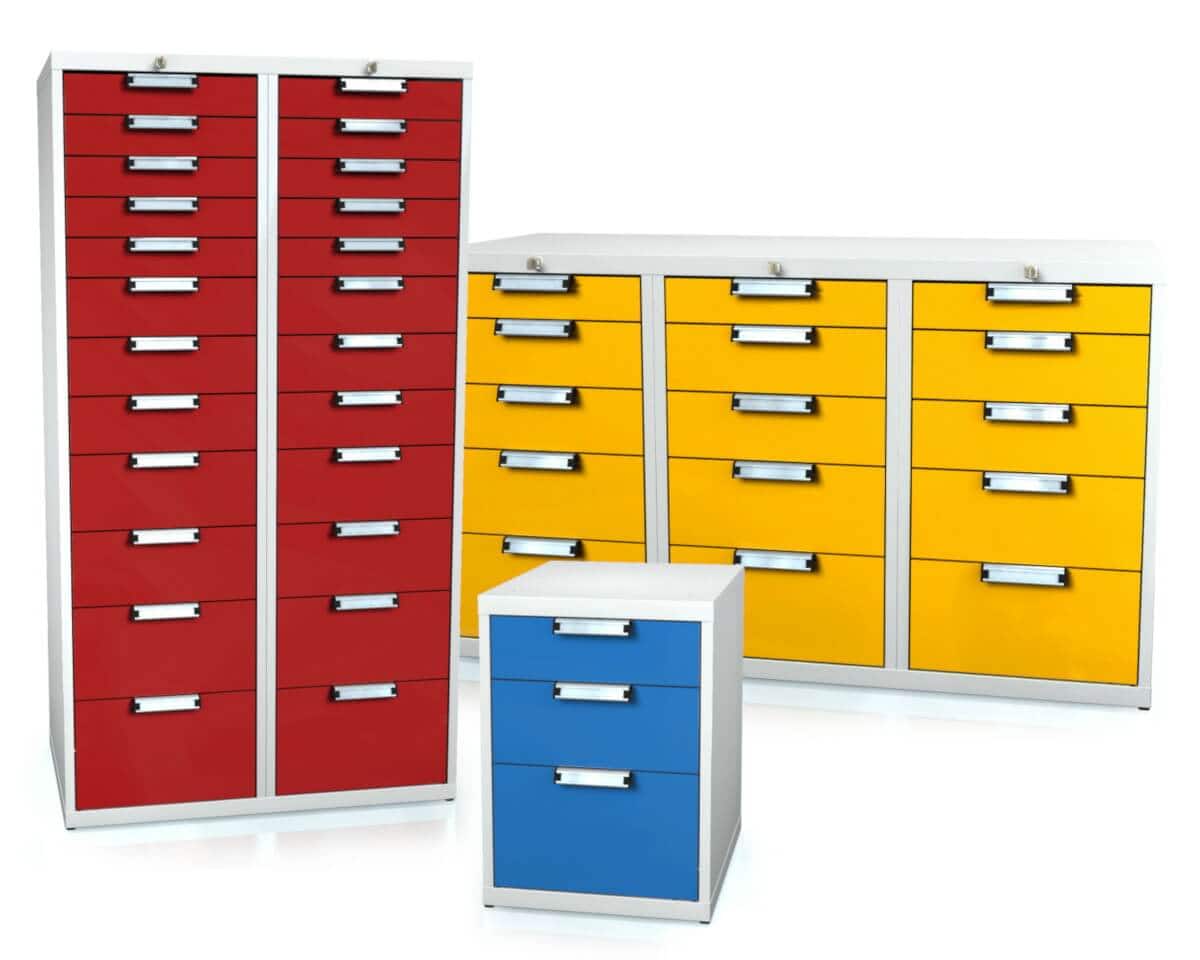 As the "UNI" metal drawer cabinets also come in a variety of different heights and widths, please refer to the individual item descriptions to find the ideal dimensions and equipment for you. We will of course be happy to advise you to find the ideal solution for your needs, which also includes optional extras.