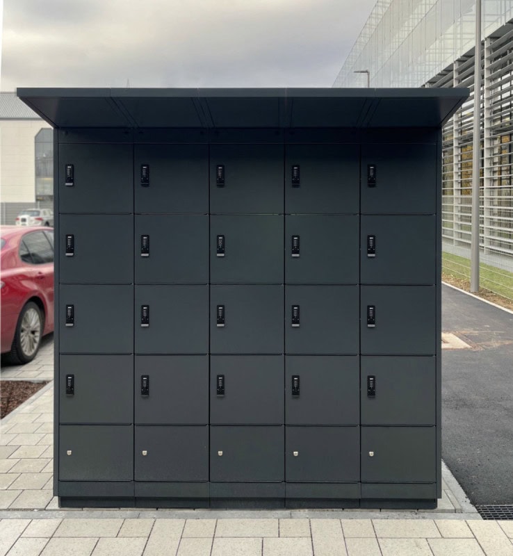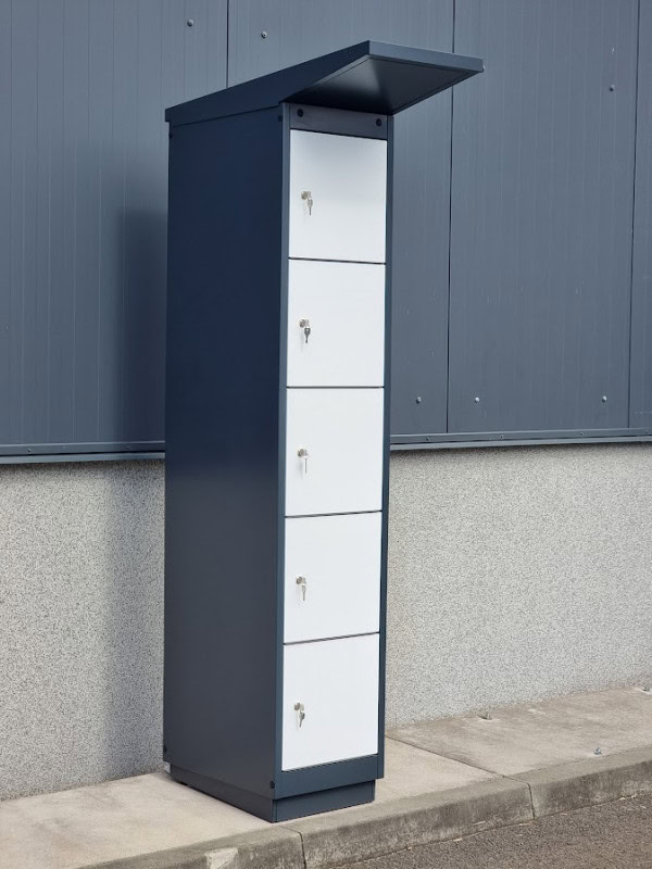 The e-bike charging point cabinet has iThe base of the carcase has corresponding holes for floor anchoring. In addition, several individual cabinets can be connected as modules to form a row of cabinets. The row of cabinets then has a continuous roof.