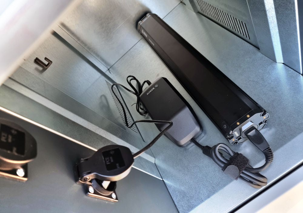 Each locker is equipped with two earthed sockets to which a bicycle battery can be connected. So if you need to "top up" your spare battery at the same time, you can use the second socket. But both e-bikers can also share a locker when travelling as a couple.