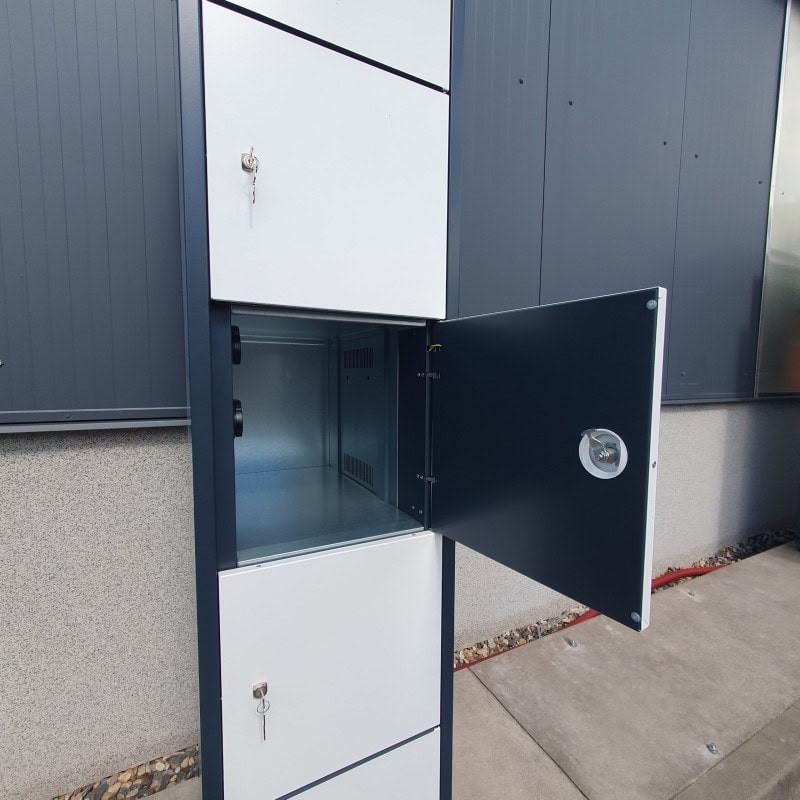 To prevent overheating and at the same time for ventilation, our e-bike charging lockers have electric forced ventilation. The fan installed for this purpose is located in the lower compartment and forcibly transports the air through all locker levels before it leaves the interior of the locker body at the top. The electrical connection and distribution box is also located in the lower compartment. The sockets in the lockers receive their power from here. However, the sockets are only energised when the locker door is closed. All sockets are also fitted with an RCD and circuit breaker.