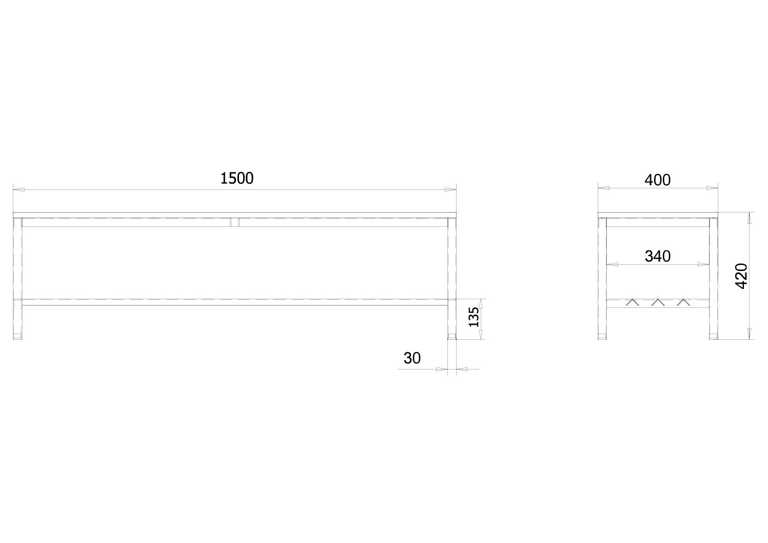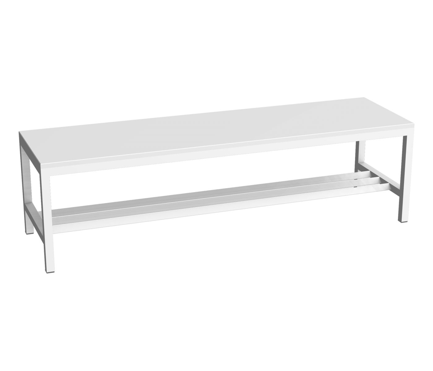 The base frame consists of sturdy legs made from 30 × 30 mm square tubing. The surface is powder-coated in RAL 7035 light grey, giving it an even, high-quality finish that is also resistant to everyday wear and tear. The shoe rack is permanently welded, which ensures a solid, durable construction and reduces the need to repeatedly retighten connections during use. Plastic glides on the feet protect the floor and make it easier to move quietly, for example when cleaning or rearranging.