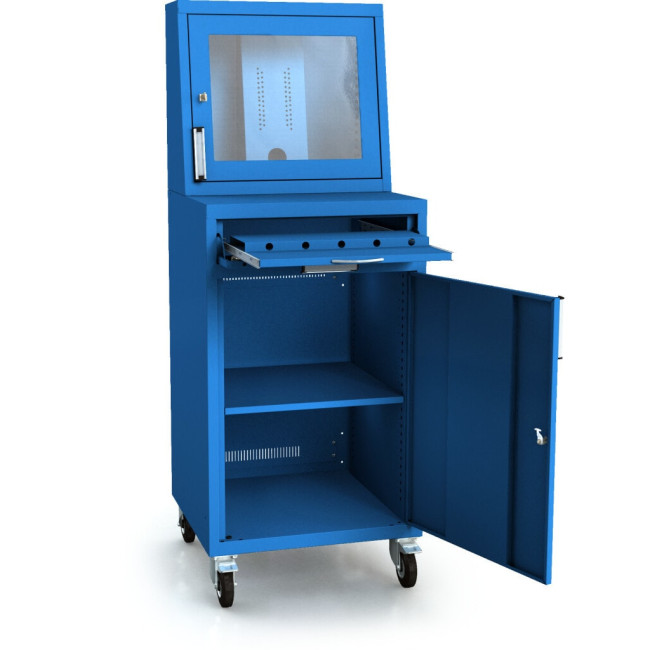 Mobile computer cabinet is specially designed to optimise space utilisation. It offers the perfect solution for a small workshop or company. The mobile computer cabinet is made of high-quality sheet steel and has a sturdy construction. The pull-out shelf provides space for a keyboard and mouse. The mobile cabinet is locked with cylinder locks. The mobile computer cabinets are available in various designs and colours. They offer an ergonomic and efficient working environment, take up less space and can be easily moved from one place to another.