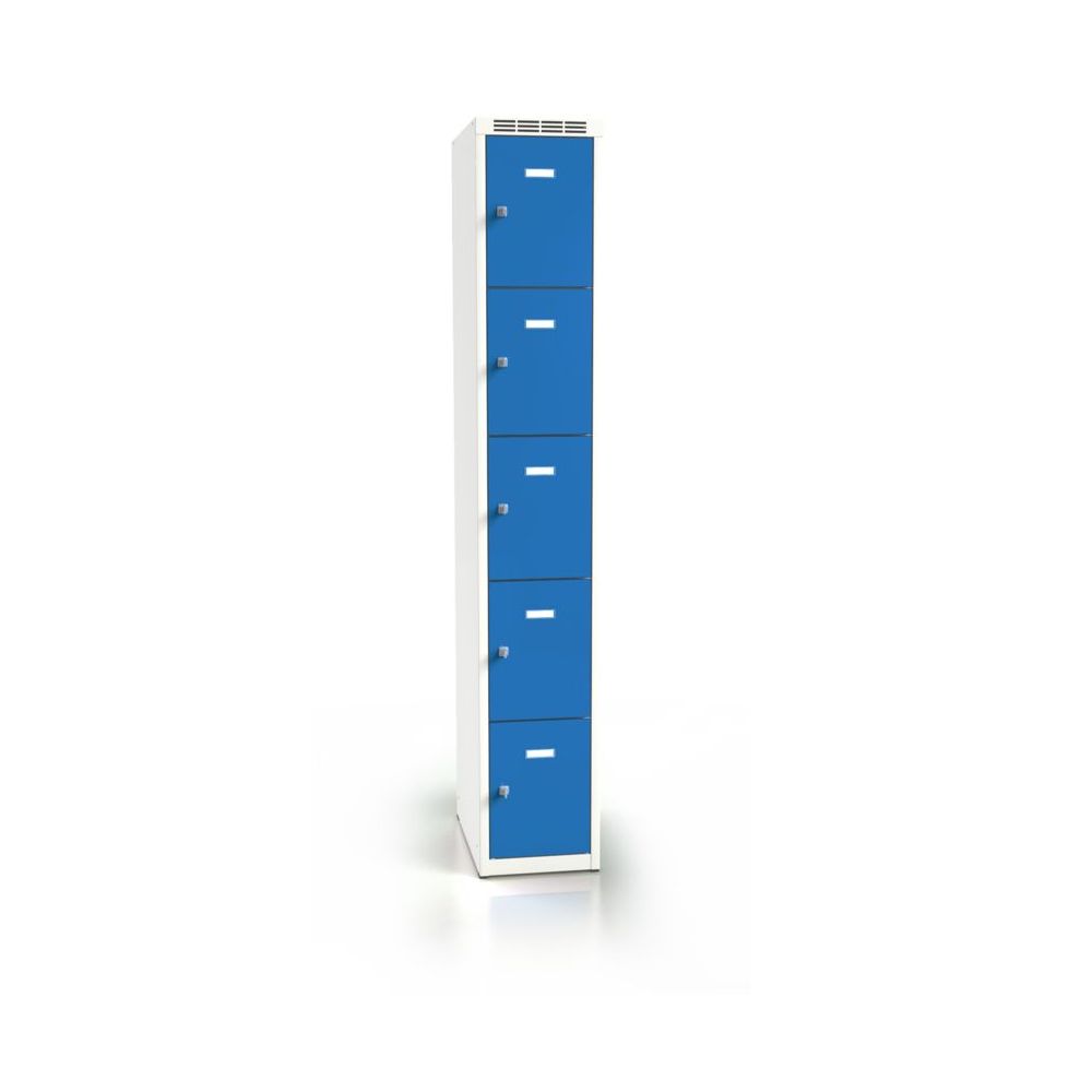 Locker cabinets with five compartments offer a well thought-out solution for secure and organised storage in schools, companies, fitness studios or public facilities. Measuring 180x30x50 cm (HxWxD) or 1800x300x500 mm, they fit perfectly into a wide variety of room concepts and offer generous storage space in a small area. The robust steel construction ensures durability and stability, while the powder-coated surface in light grey (RAL7035) gives the body a modern, timeless appearance. The doors can be individually selected in terms of colour and can therefore be perfectly matched to the respective room design.