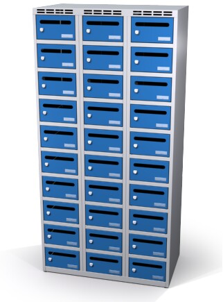 Mail distribution cabinet with 30 compartments can be fitted with a high plinth