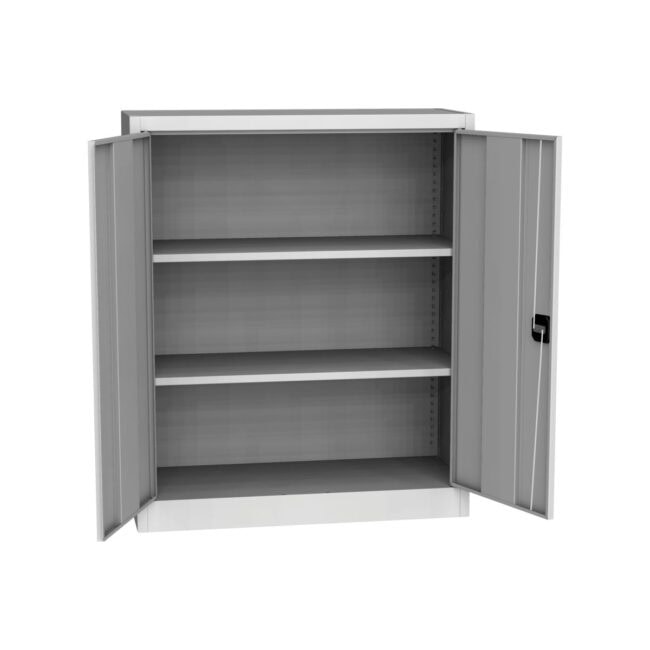 Universal cabinet 1150 x 950 x 400 mm (H x W x D) in RAL7035 light grey brings order to work areas where reliability matters. The welded construction feels sturdy and stands for long-lasting everyday use, whether in the warehouse, workshop, or technical room. The body and doors are powder-coated, so the surface remains resistant in daily operation and is easy to keep clean. The centrally reinforced cabinet doors provide a secure feel when opening and closing and help maintain a consistently precise fit over time.