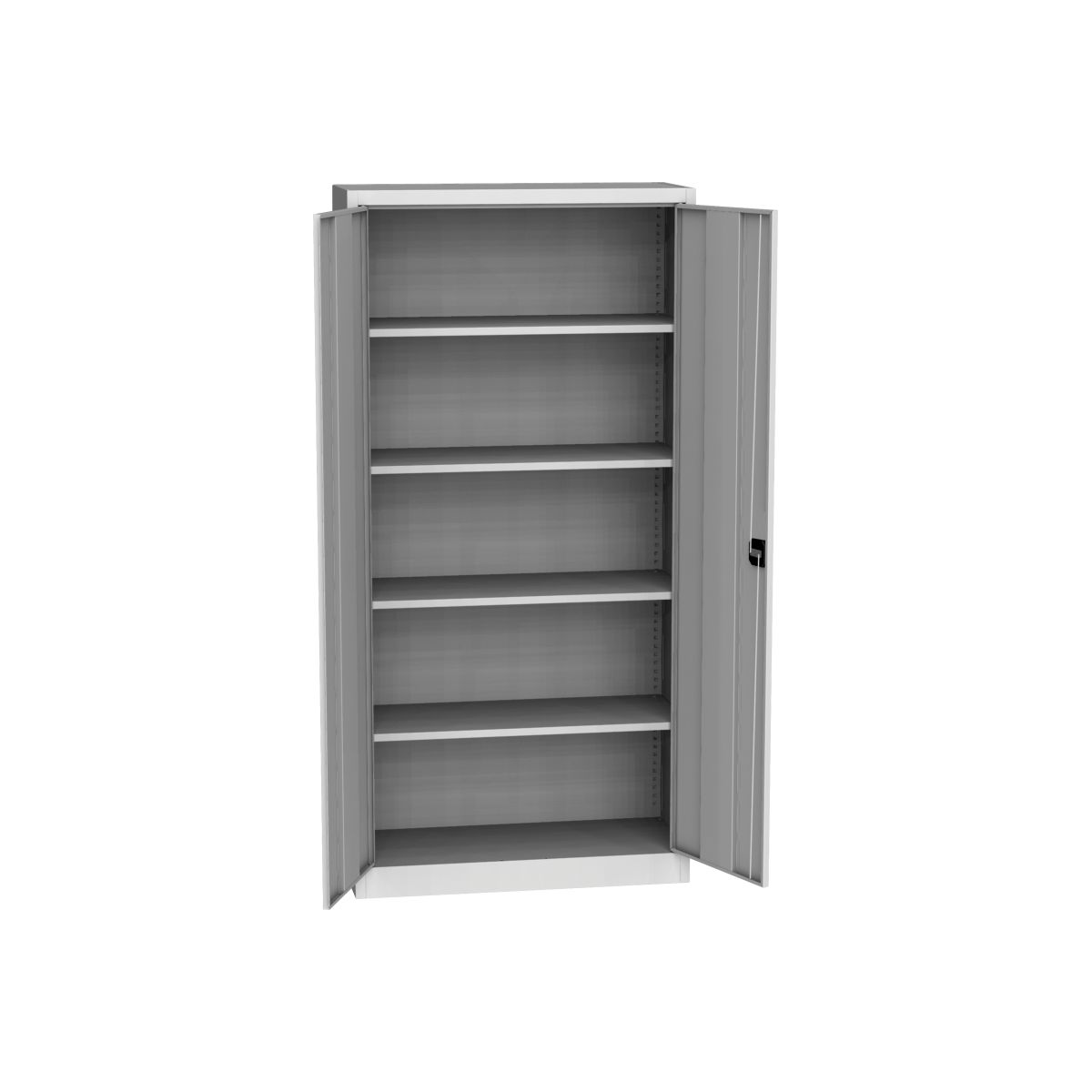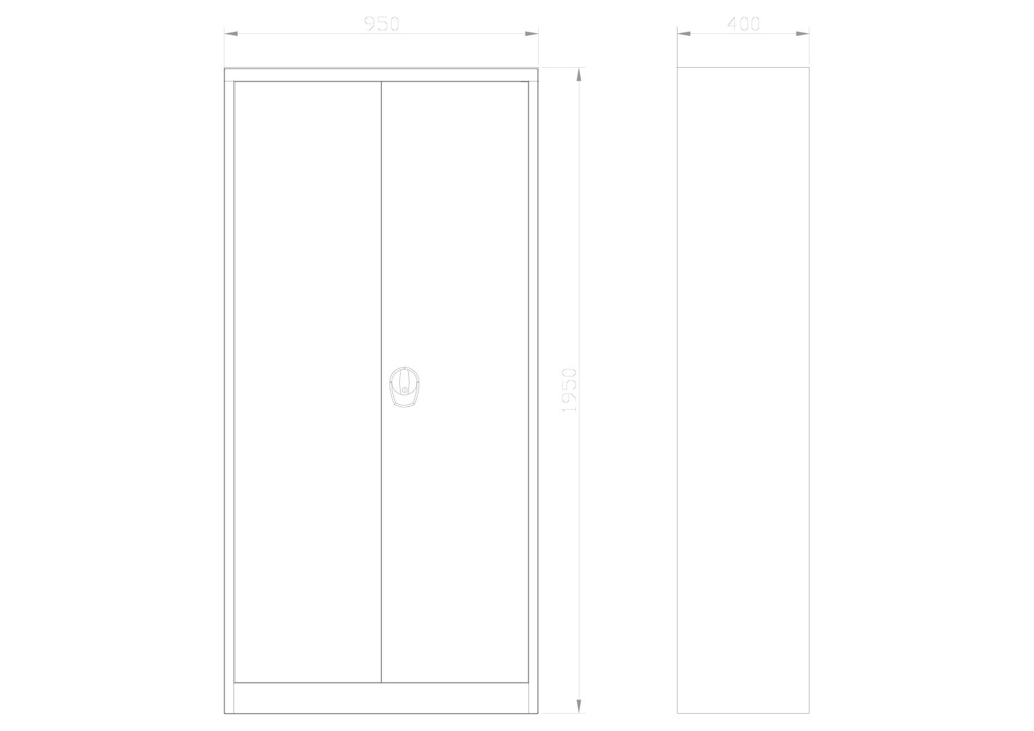 1950x950x400 mm (H×W×D), welded construction, 4 painted shelves, height-adjustable, load capacity 60 kg per shelf, two-point locking system, cylinder lock with rotating handle, cabinet doors reinforced in the center, body/doors RAL 7035 light grey, powder-coated
