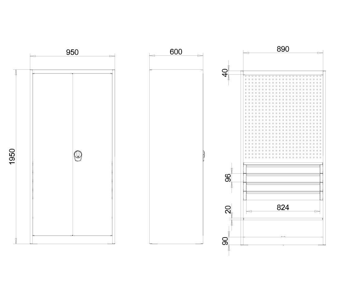 The dimensions of 195 × 95 × 60 cm offer plenty of storage space with a clear footprint, so that the …so that the cabinet remains easy to plan for even in narrower workshop aisles.. Load-bearing shelves, heavy-duty drawers, and the perforated surfaces combine structure, access, and safety in a single piece of furniture made for everyday work. Anyone looking for a sturdy workshop cabinet with well-thought-out storage space, a clean look, and reliable locking will find a solution here that makes keeping things organized easier in the long run.