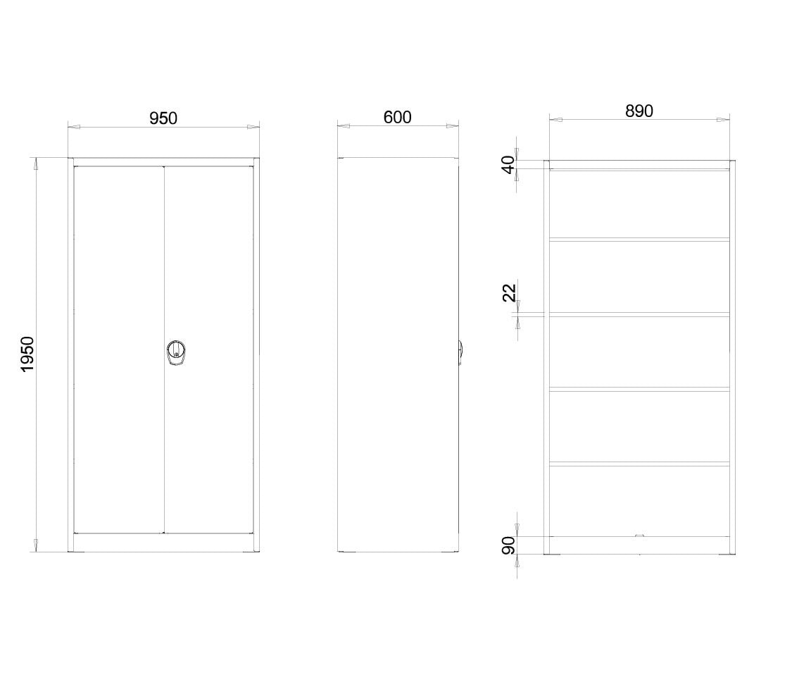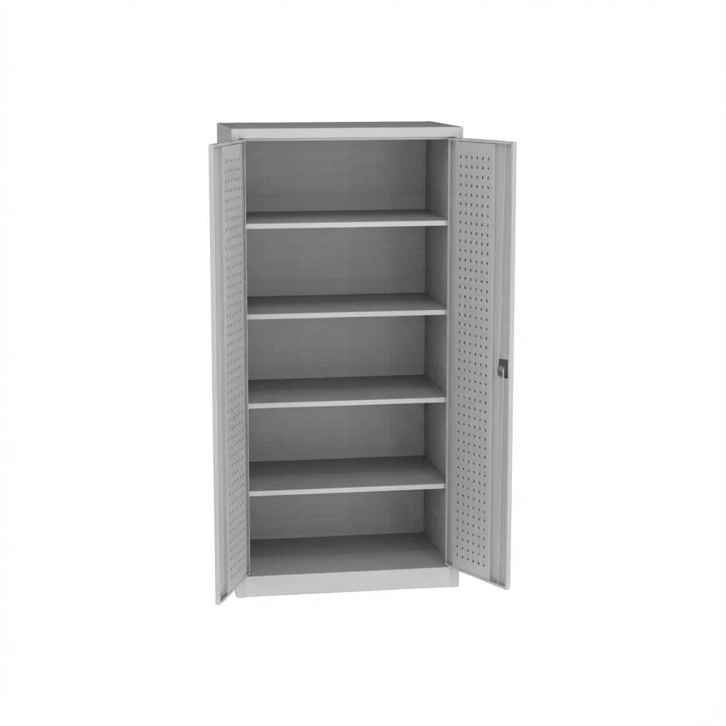 In technical rooms, workshops, or maintenance areas, clear structures and reliable safety are essential. This cabinet supports standardized processes: defined compartments for spare parts, cleaning and maintenance supplies, personal issue items, or documentation-relevant materials. Its sturdy, welded construction is designed for long-term use, and the four shelves can be adjusted to changing inventories without much effort. A clean light-grey look reinforces a tidy appearance in visible areas, such as issue counters or workshop zones with customer contact. The perforated inner door panels provide additional storage space without requiring more floor space—ideal for cables, hoses, PPE, or frequently needed hand tools. Locking via a cylinder lock and two-point locking helps secure stock and keep responsibilities clearly defined.