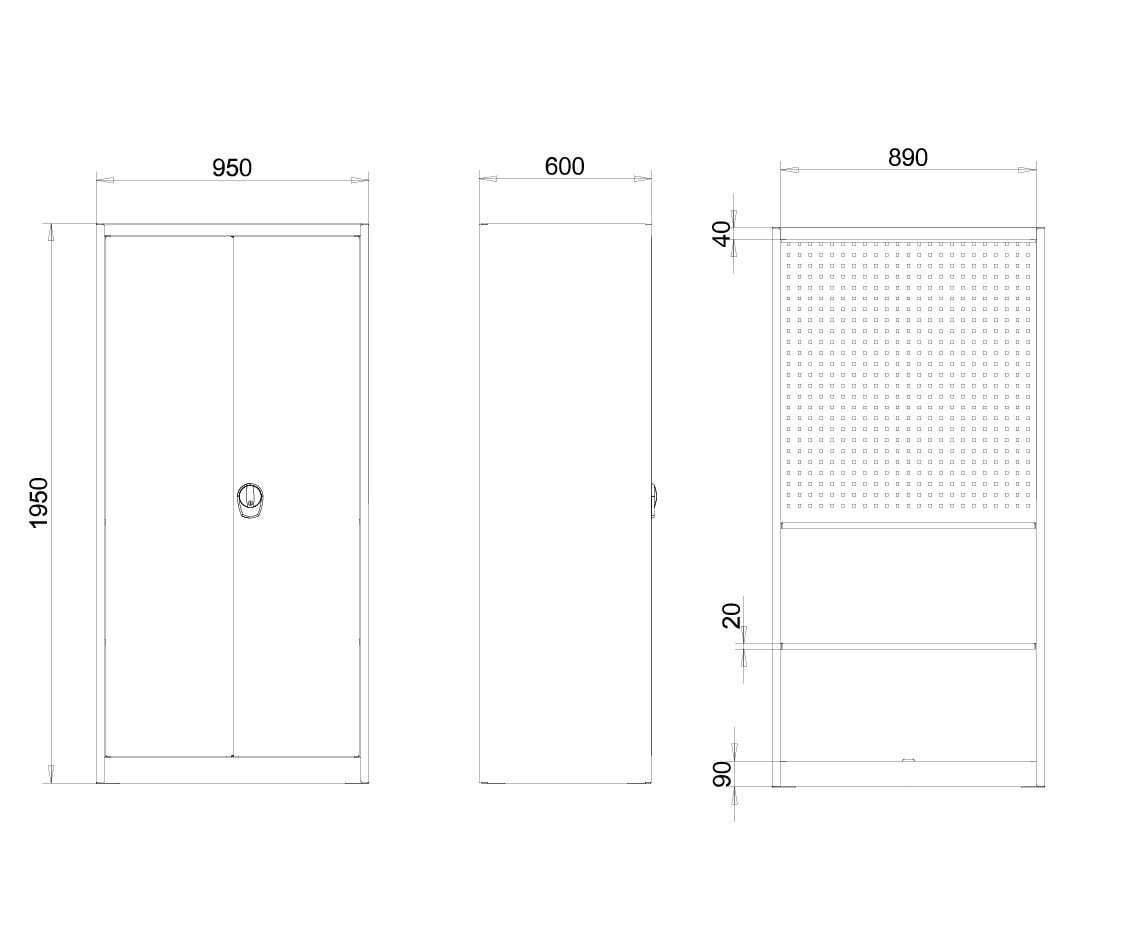 Order, quick access, and secure storage: This workshop cabinet in 1950 x 950 x 600 mm (H x W x D) is designed for tough use. Made for everyday use in the workshop, maintenance, and production.. The welded construction ensures outstanding stability—even with daily opening, loading, and rearranging. The cabinet body and doors feature a powder-coated finish in RAL 7035 Light Grey, making them easy to maintain, hard-wearing, and a perfect visual match for typical industrial environments.